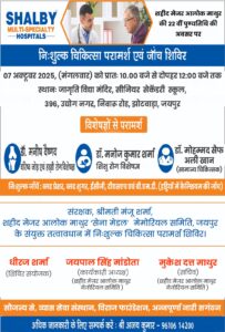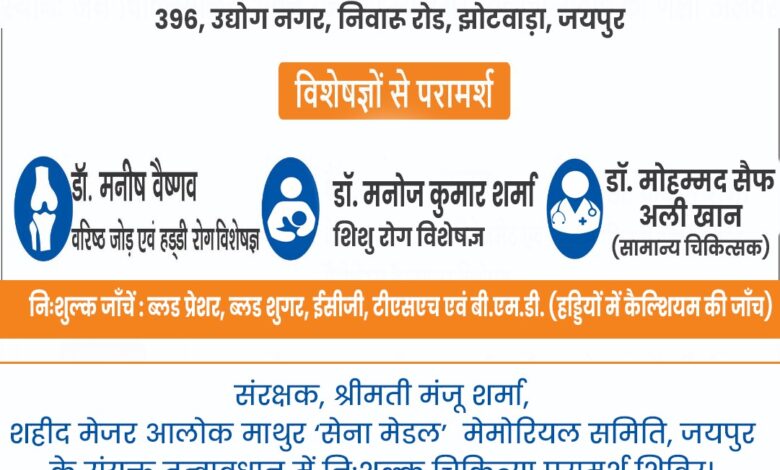 जयपुर। शहीद मेजर आलोक माथुर जी की 22वीं पुण्यतिथि के अवसर पर दिनांक 7 अक्टूबर 2025, मंगलवार को शहीद मेजर आलोक माथुर सेना मेडल मेमोरियल समिति एवं शैल्बी हॉस्पिटल के तत्वावधान में एक निःशुल्क चिकित्सा परामर्श एवं जांच शिविर का आयोजन किया जा रहा है।यह शिविर जागृति विद्या मंदिर स्कूल, निवारू रोड, जयपुर में प्रातः 10 बजे से दोपहर 12 बजे तक आयोजित होगा। इस अवसर पर अनुभवी चिकित्सक दल द्वारा सामान्य स्वास्थ्य परीक्षण, परामर्श एवं आवश्यक जांचें निःशुल्क की जाएंगी।