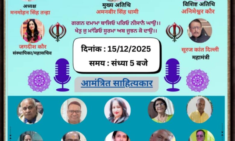 प्रयागराज उ.प्र.की ख्यात-नाम कवयित्री श्रीमती जगदीश कौर के संयोजन में संचालित काव्य-समूह “जगदीश साहित्य संस्थान द्वारा विगत दिवस,सिख इतिहास में 22दिसंबर से 26 दिसंबर तक प्रतिवर्ष मनाए जाने वाले सप्ताह के तत्वावधान में,गुरु गोविंदसिंह जी के चार साहिबज़ादों की लासानी शहादत को समर्पित काव्य-गोष्ठी “गूगल-मीट” के माध्यम से दिनाँक 15 दिसंबर ’25 को सायं 05 बजे से 09 बजे तक संपन्न हुई।इस गोष्ठी में विदेश तथा देश के विभिन्न प्रांतों के नामचीन कवि/कवयित्रीवृंद नें अपने स्वरचित काव्य-सृजन के माध्यम से गुरु गोविंद सिंह जी को व उनके चार साहिबज़ादों की लासानी शहादत को स्मरण करते हुए उन्हें अपनी “काव्य-श्रद्धाँजली” नम आँखों से प्रस्तुत की।