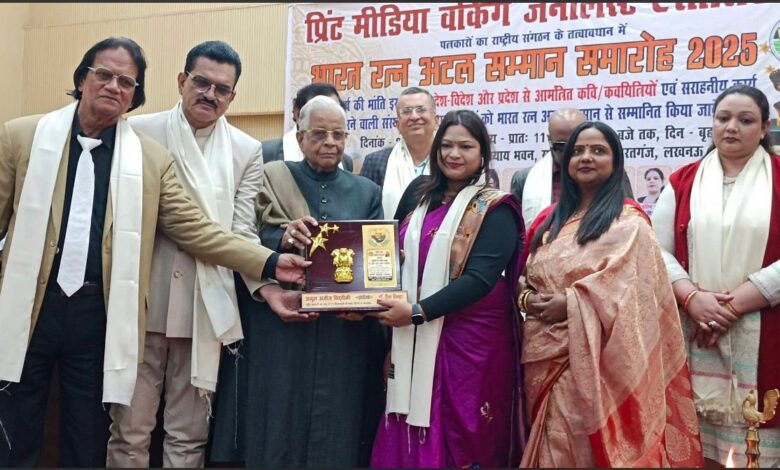 लखनऊ। पंजीकृत पत्रकारों के राष्ट्रीय संगठन प्रिंट मीडिया वर्किंग जर्नलिस्ट एसोसिएशन के तत्वावधान में आयोजित भारत रत्न अटल सम्मान समारोह 2025 का भव्य आयोजन किया गया। इस समारोह में देश-विदेश तथा भारत के विभिन्न प्रदेशों में साहित्य, समाज सेवा एवं पत्रकारिता के क्षेत्र में उल्लेखनीय योगदान देने वाले विशिष्ट व्यक्तियों को सम्मानित किया गया। इस अवसर पर नोएडा निवासी एवं मूल रूप से गाजीपुर (उत्तर प्रदेश) की साहित्यकारा मैत्रेयी त्रिपाठी ‘मुग्धा’ को साहित्य के क्षेत्र में उनके उत्कृष्ट एवं उल्लेखनीय योगदान के लिए सम्मानित किया गया। यह सम्मान उन्हें सूचना एवं प्रसारण विभाग, लखनऊ में आयोजित समारोह के दौरान एसोसिएशन के राष्ट्रीय अध्यक्ष अब्दुल अज़ीज़ सिद्दीकी एवं उपाध्यक्ष डॉ. रीमा सिन्हा द्वारा प्रदान किया गया।