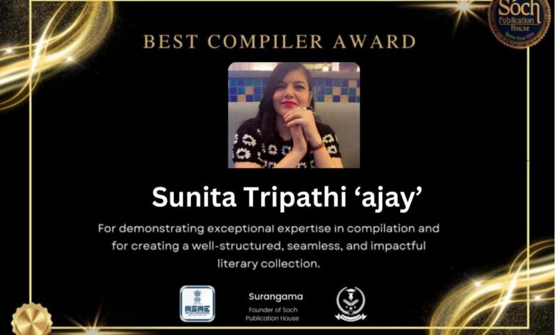 पुरस्कार प्राप्त करते हुए सुनिता त्रिपाठी ‘अजय’ ने सोच पब्लिकेशन के प्रति आभार व्यक्त किया और कहा कि यह सम्मान उन्हें साहित्य के क्षेत्र में और अधिक निष्ठा एवं प्रतिबद्धता के साथ कार्य करने की प्रेरणा देता है। उन्होंने सभी सहयोगी रचनाकारों और पाठकों का भी धन्यवाद किया।