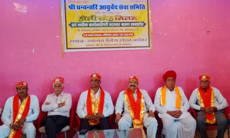 उदयपुर। भटेवर में रविवार को एक निजी होटल के स्वागत सभागार में आयोजित भव्य एवं गरिमामय समारोह में श्री धन्वंतरि आयुर्वेद सेवा समिति, भटेवर की नवीन त्रिवर्षीय कार्यकारिणी का पदभार ग्रहण समारोह एवं होली स्नेह मिलन कार्यक्रम उत्साहपूर्वक सम्पन्न हुआ। यह आयोजन भटेवर स्थित स्वागत पैलेस होटल के सभागार में प्रातः 11 बजे प्रारंभ हुआ, जिसमें समाज के अनेक गणमान्य व्यक्तियों, पदाधिकारियों एवं सदस्यों ने भाग लिया। इस आयोजन ने समाज में एकता, सहयोग एवं सामाजिक दायित्वों के प्रति जागरूकता को और अधिक सुदृढ़ करने का संदेश दिया।