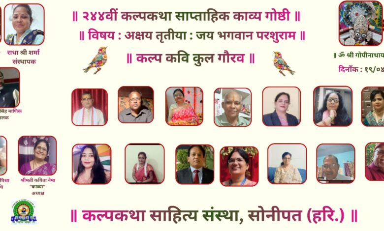 प्रभु श्री राधा गोपीनाथ जी महाराज की कृपा से संचालित, राष्ट्र प्रथम, हिन्दी भाषा, सनातन संस्कृति, एवं सद साहित्य हेतु कृत संकल्पित कल्पकथा साहित्य संस्था परिवार, सोनीपत (हरियाणा) की संवाद प्रभारी ज्योति राघव सिंह ने बताया कि संस्था के तत्वावधान में २४५वीं साप्ताहिक काव्यगोष्ठी का भव्य एवं गरिमामय आयोजन “जय भगवान परशुराम” विषय पर संपन्न हुआ।
