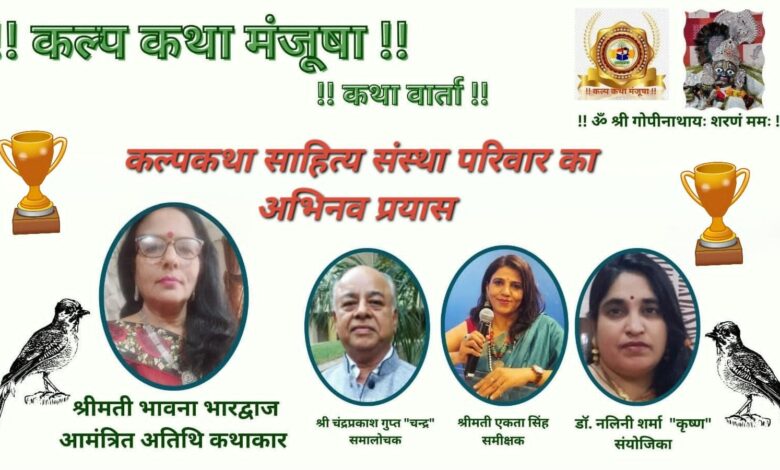 कल्पकथा साहित्य संस्था के यूट्यूब चैनल पर सीधे प्रसारण के समीक्षा एवं समालोचना के विशेष प्रारूप के आयोजन में साहित्य सेवारत प्रबुद्ध साहित्यकार श्रीमती भारद्वाज को मंजूषा प्रशस्ति पत्रम से सम्मानित करते हुए उन्हें भविष्य हेतु मंगलकामनाएं प्रेषित की गईं।