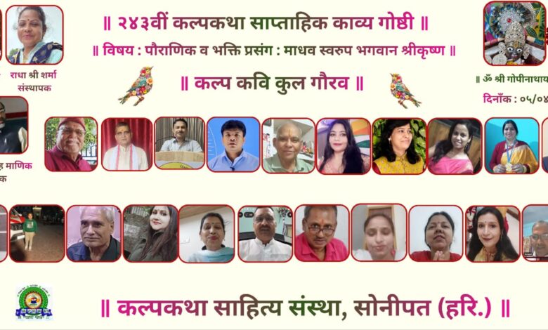 प्रभु श्री राधा गोपीनाथ जी महाराज की कृपा से संचालित राष्ट्र प्रथम हिन्दी भाषा सनातन संस्कृति एवं सद साहित्य हेतु कृत संकल्पित कल्पकथा साहित्य संस्था की संवाद प्रभारी श्रीमती ज्योति राघव सिंह ने बताया कि संस्था परिवार के तत्वावधान में आयोजित २४३वीं साप्ताहिक पौराणिक एवं भक्ति प्रसंग आधारित ऑनलाइन काव्यगोष्ठी का आयोजन माधव स्वरूप भगवान श्रीकृष्ण विषय पर अत्यंत श्रद्धा, सौंदर्य एवं भावमाधुर्य के साथ संपन्न हुआ। इस अनुपम आयोजन में भक्ति, दर्शन और काव्य का अद्वितीय समन्वय दृष्टिगोचर हुआ, जहाँ प्रत्येक रचना श्रीकृष्ण के माधुर्य, करुणा एवं दिव्यता की सजीव अभिव्यक्ति बनकर उभरी।